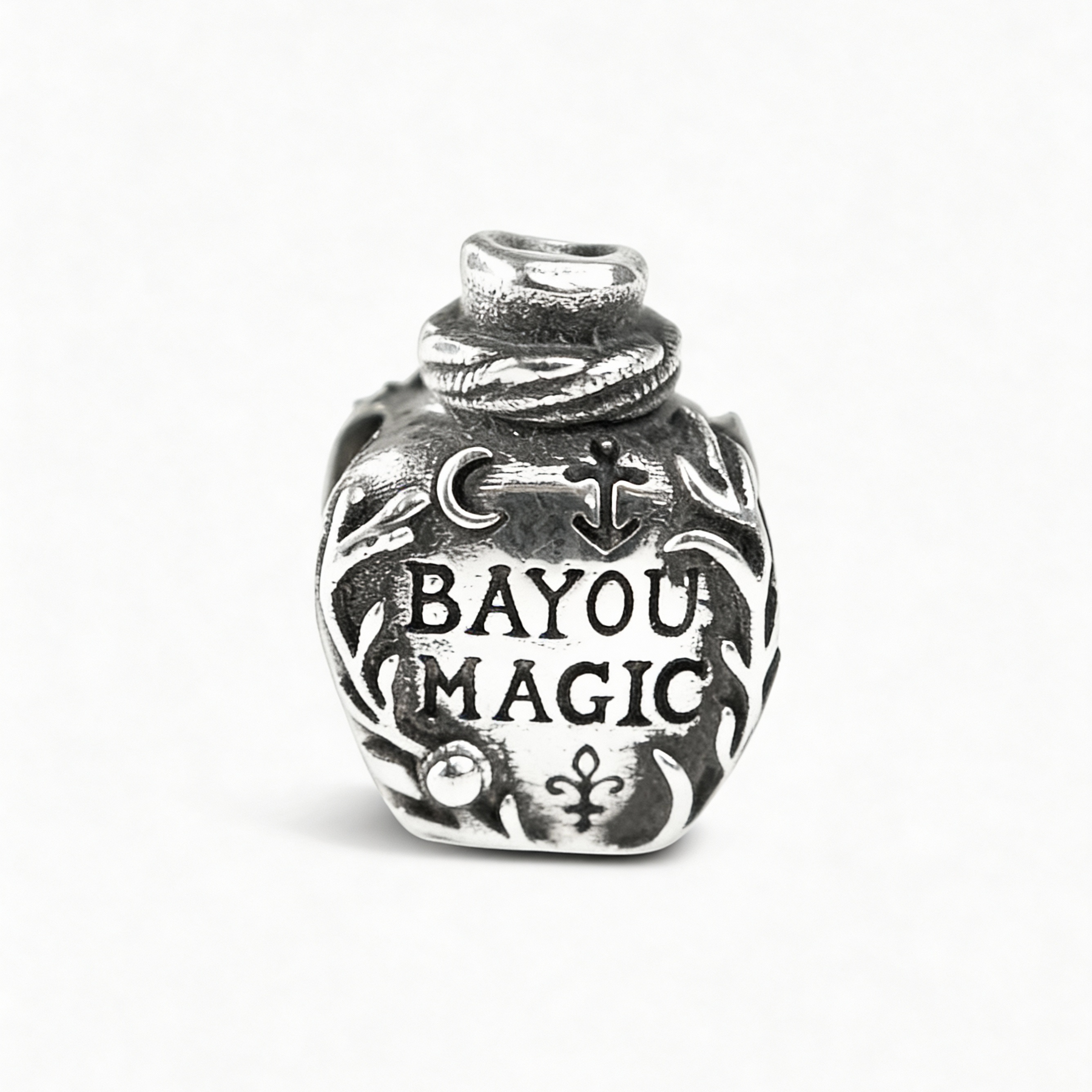 This little bayou potion bottle holds a touch of Louisiana mystery. Its surface is engraved with intricate symbols — a fleur-de-lis, a crescent moon, and an anchor. In the bayou, a potion like this might be brewed for protection, good fortune, or even to draw a bit of romance your way. Whether you see it as a spell bottle, a keepsake of the swamp, or a talisman of the Crescent City, it’s a charm filled with local lore and magic.
