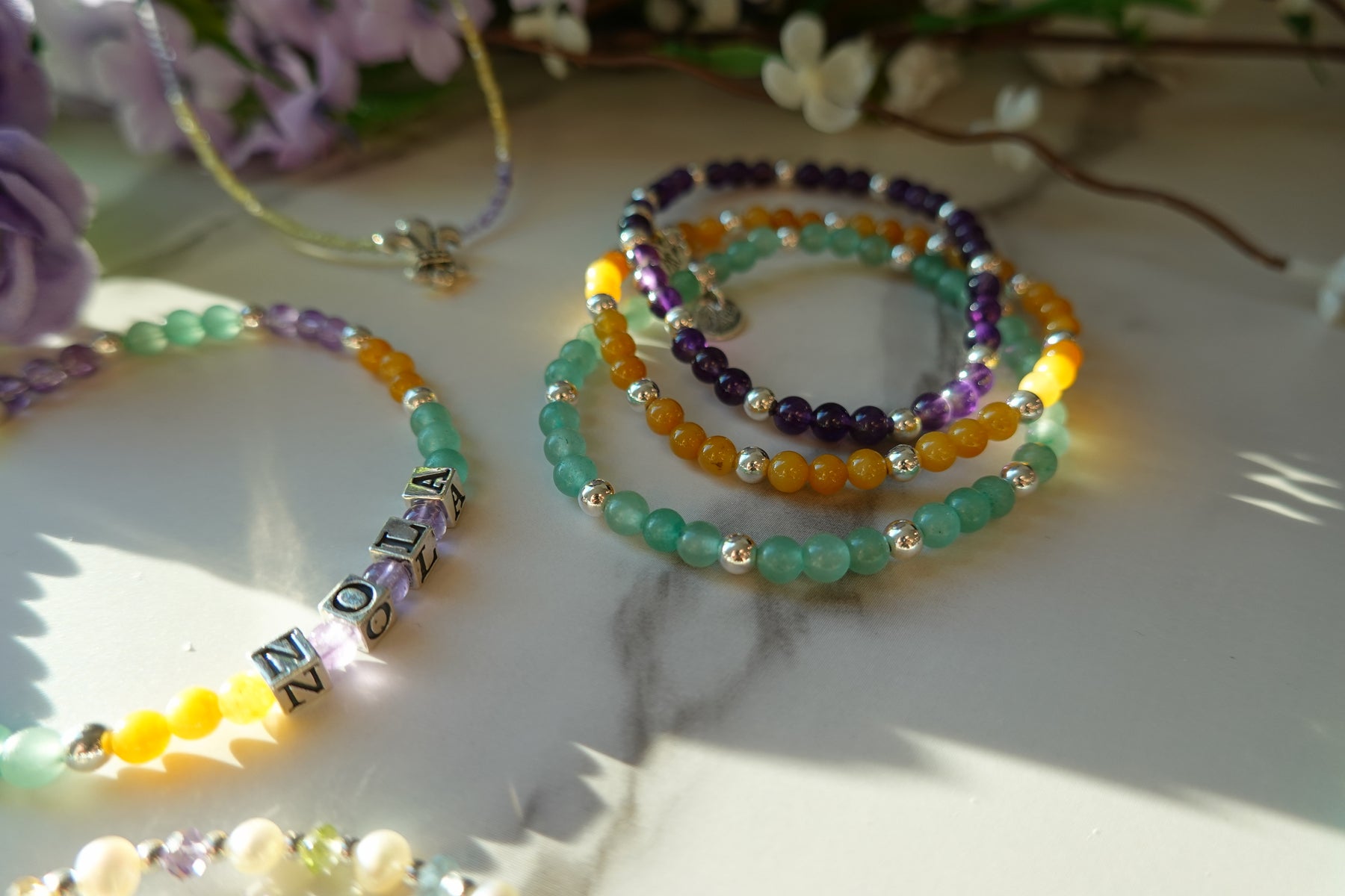 Collect our seasonal set of amethyst, yellow jade and green aventurine bracelet stack