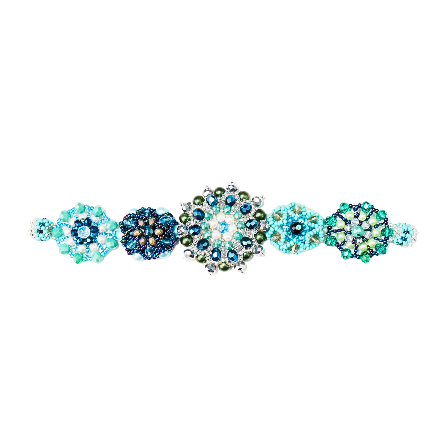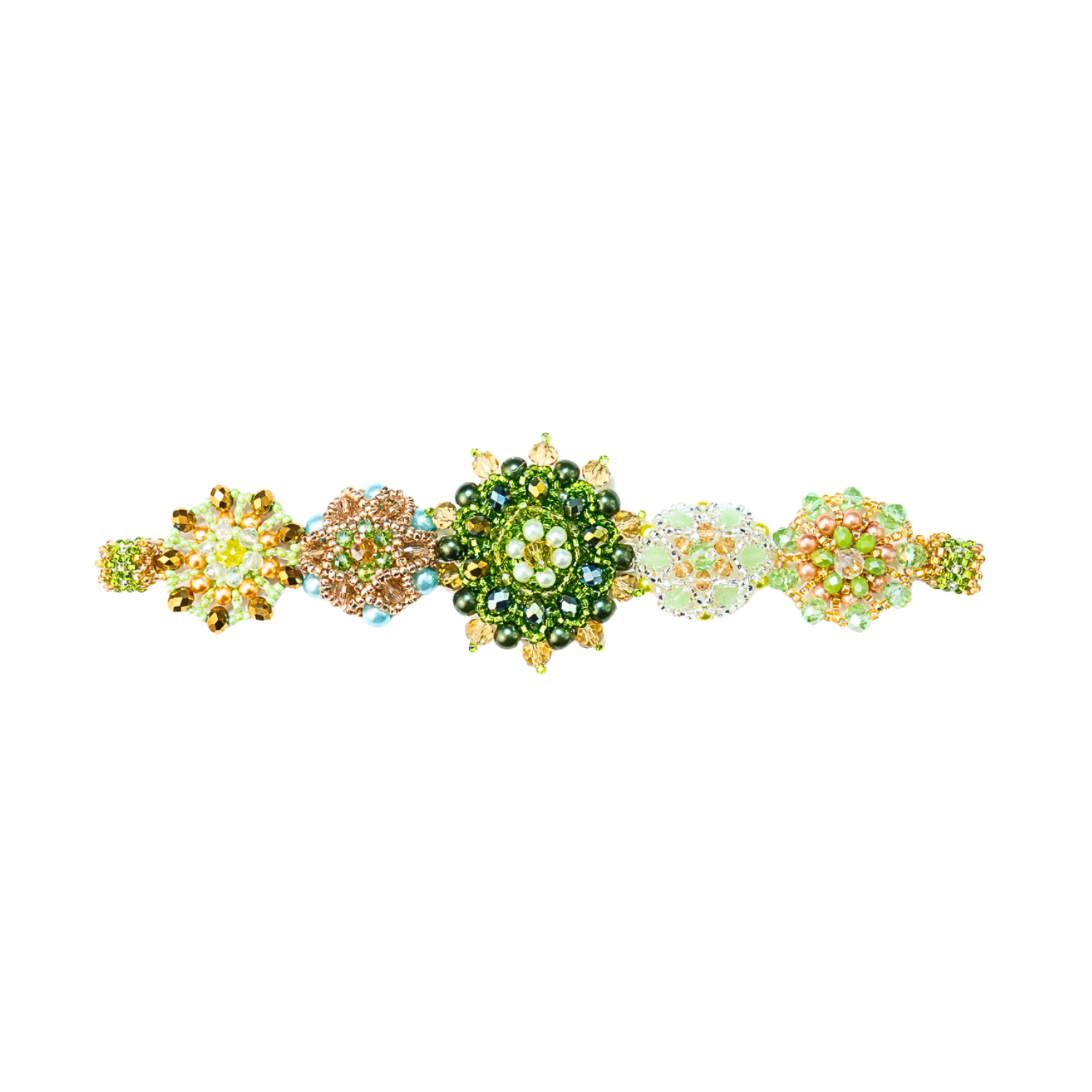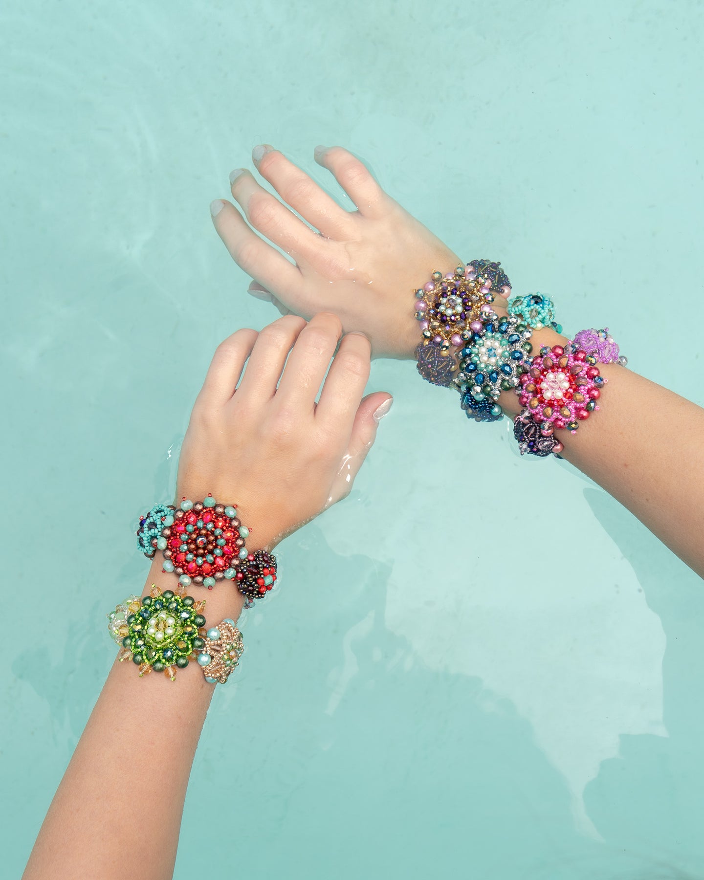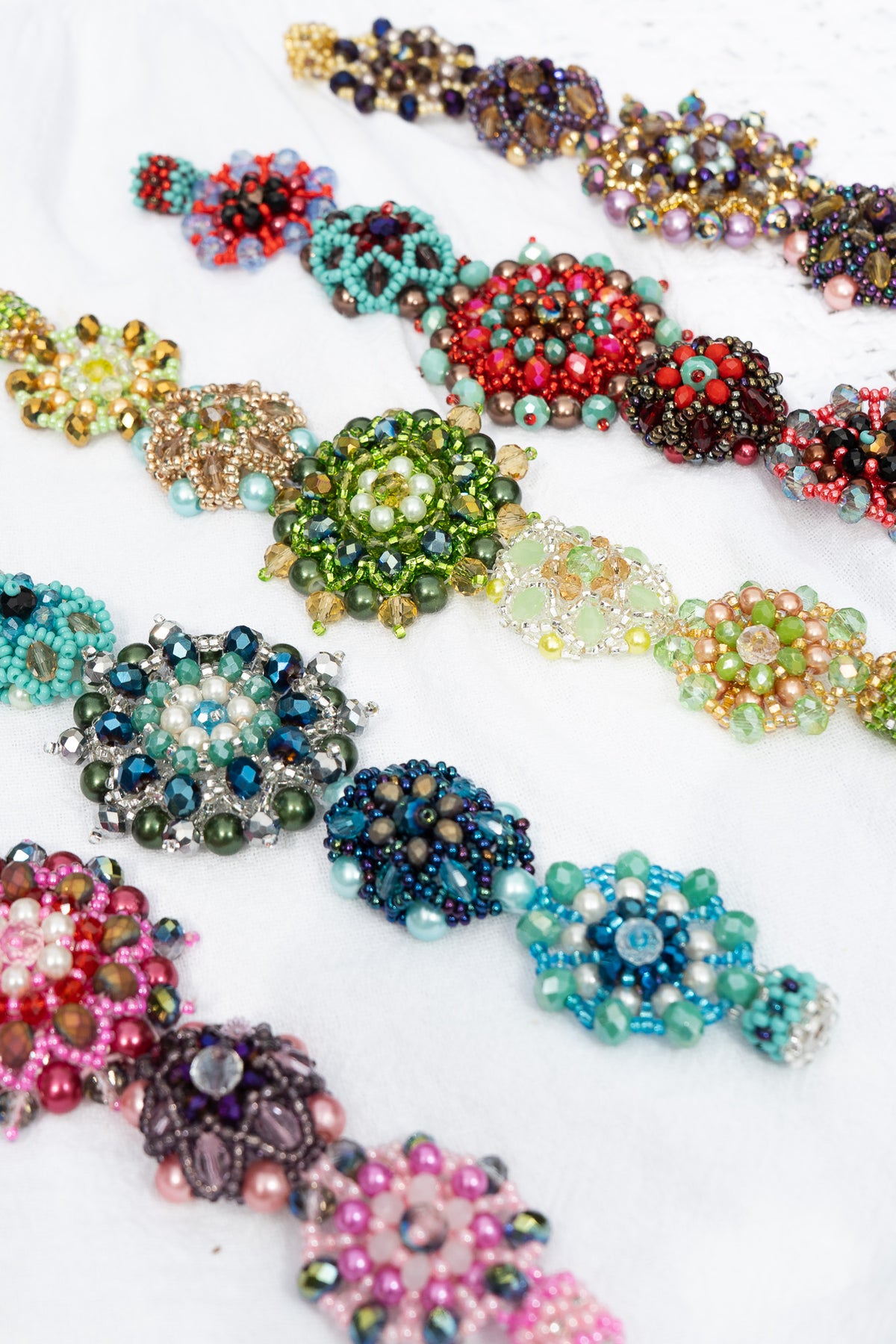 Each bloom is built by hand, one bead at a time, forming dimensional flowers that sit slightly raised along the wrist. There’s something deeply satisfying about that texture - the way each shape holds its own space, while still feeling connected to the whole.