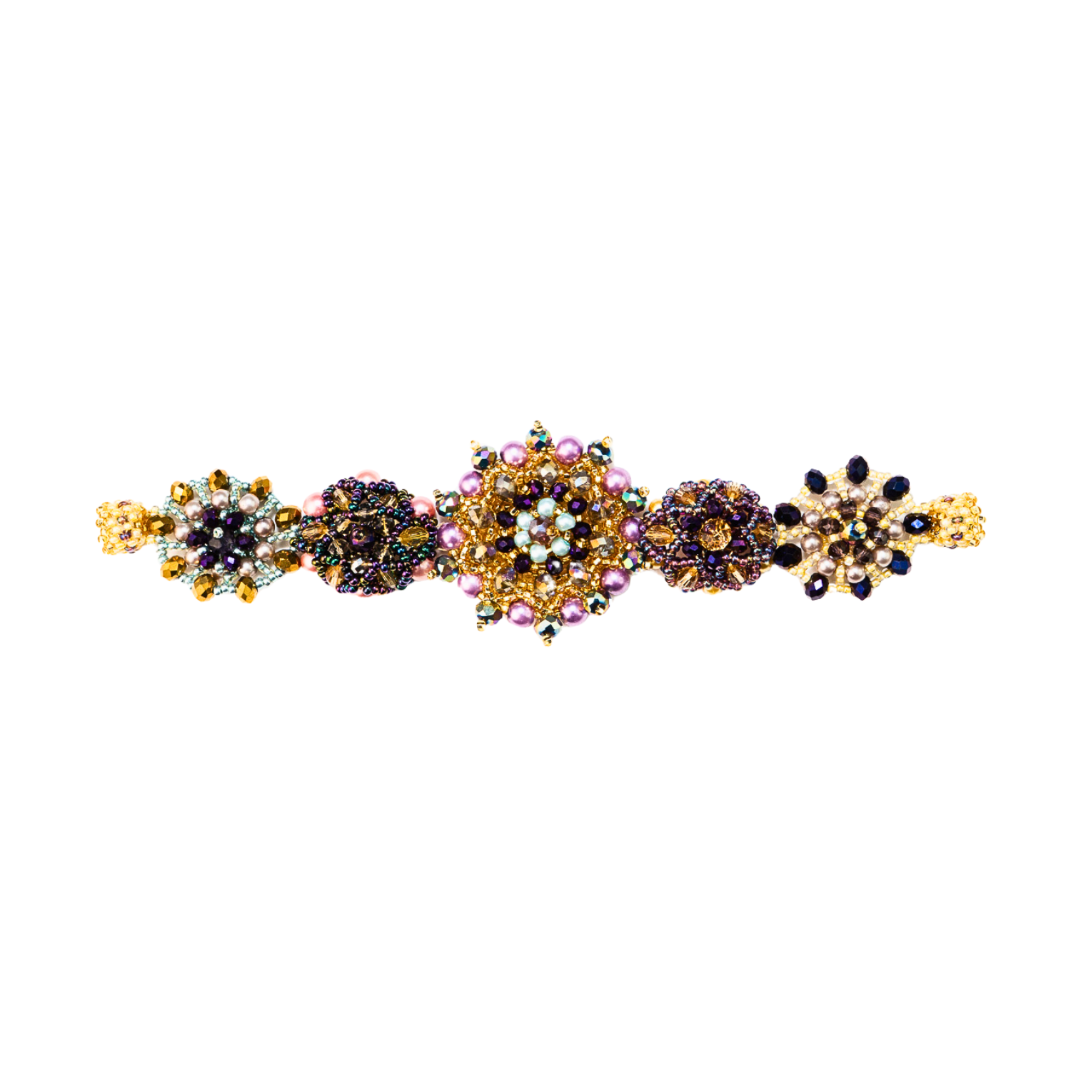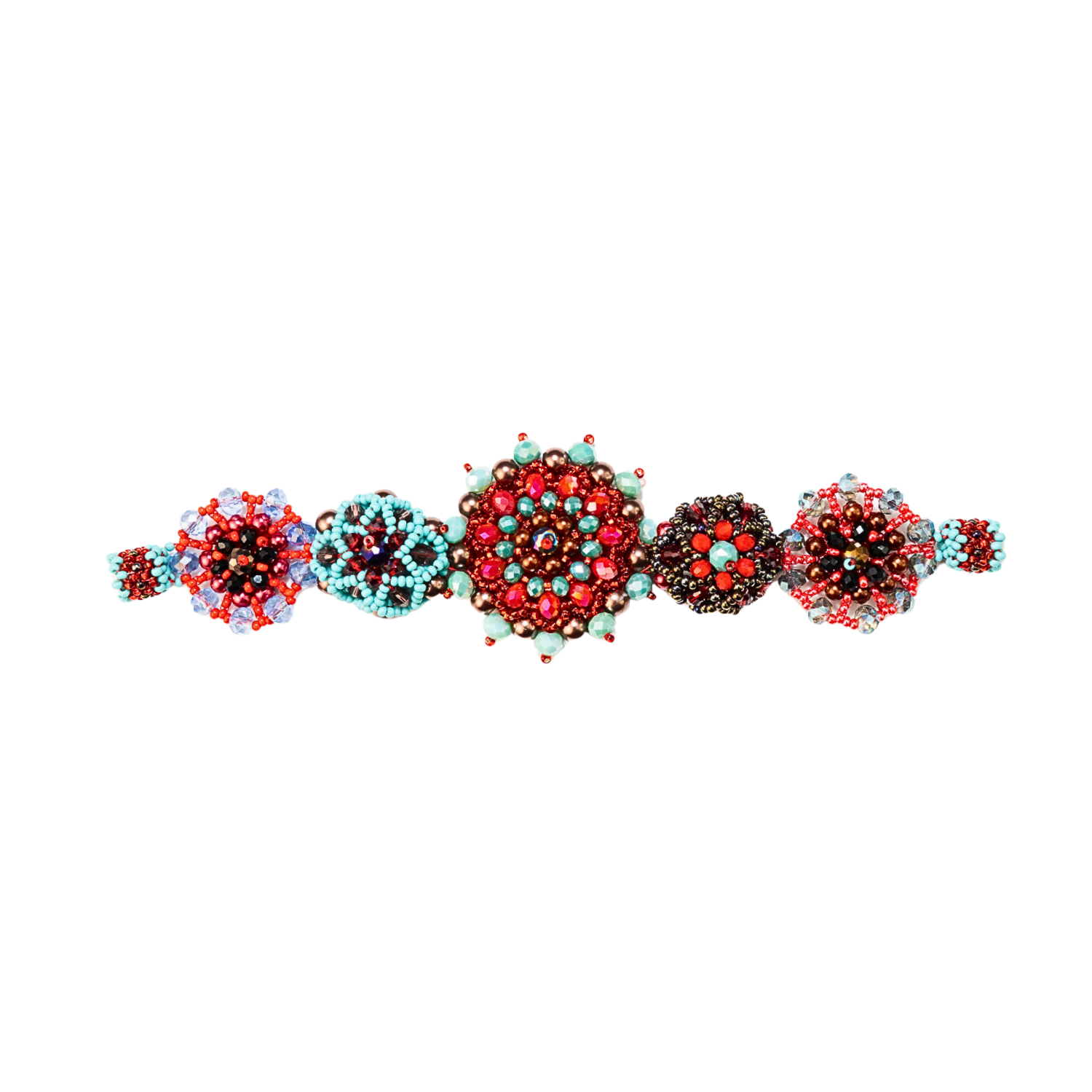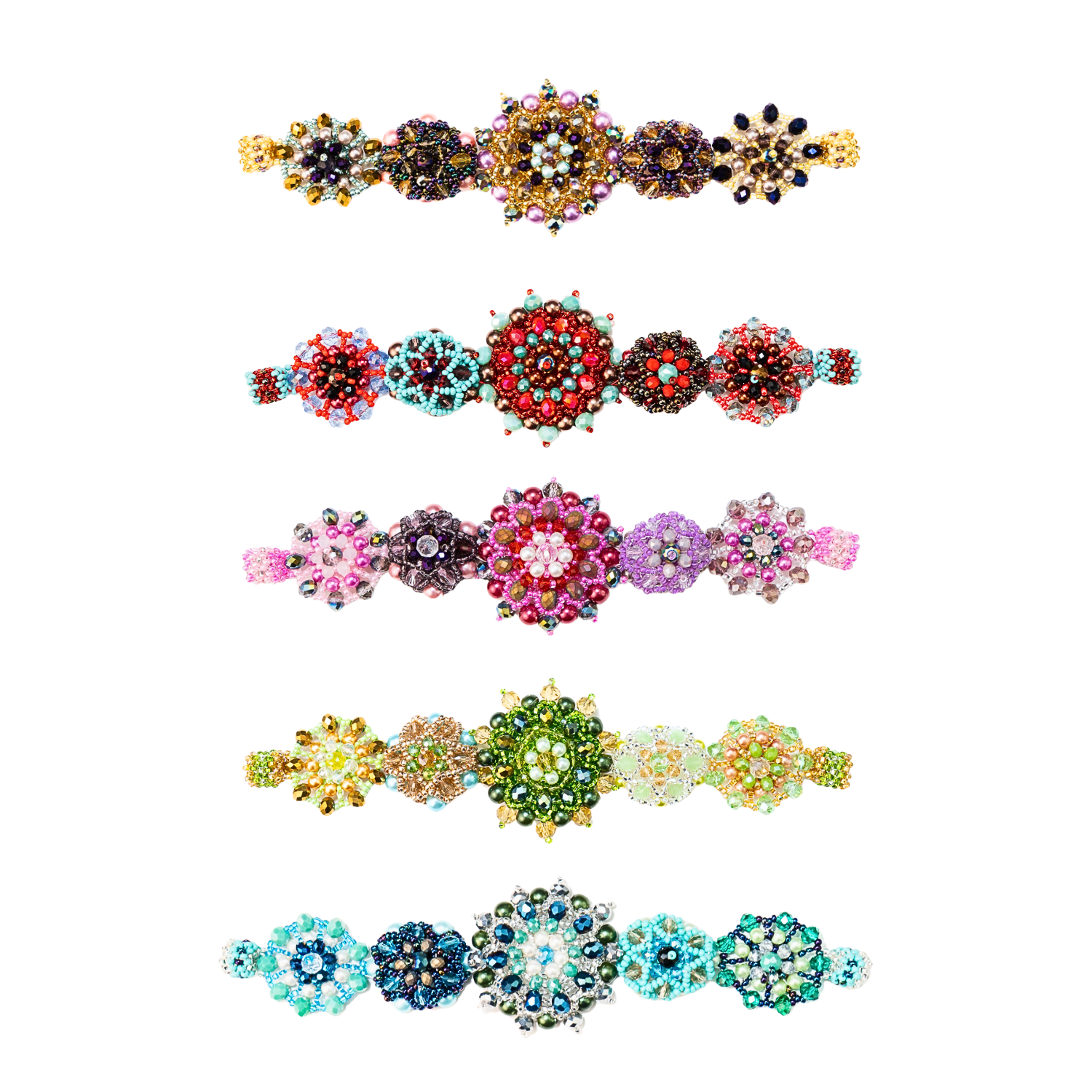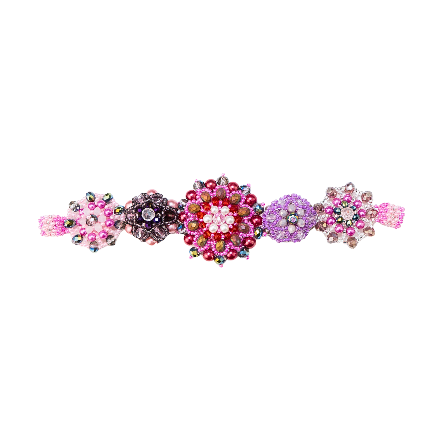 Each bloom is built by hand, one bead at a time, forming dimensional flowers that sit slightly raised along the wrist. There’s something deeply satisfying about that texture - the way each shape holds its own space, while still feeling connected to the whole.