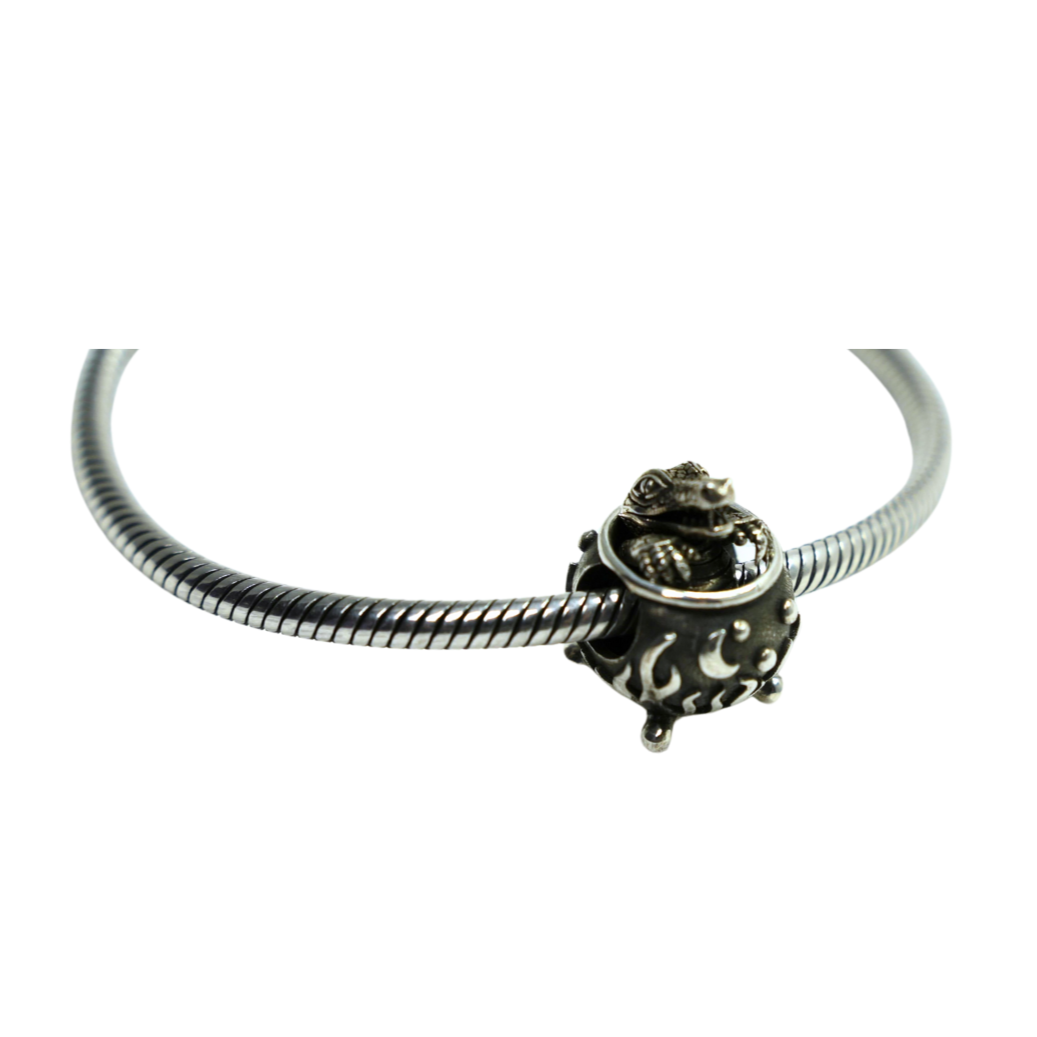 This charm is pure whimsy with a magical twist! Inspired by swamp folklore and a dash of Halloween mischief, it features a detailed gator who can sit snugly inside a bubbling cauldron, or be worn side-by-side for a playful look. The cauldron is adorned with flame details, while the gator has a textured, lifelike finish that peeks out over the rim.